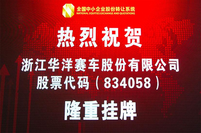 據(jù)悉,浙江華洋賽車股份有限公司于2015年11月2日成功登陸全國中小企業(yè)股份轉(zhuǎn)讓系統(tǒng)(“新三板”),證券簡稱為“華洋賽車”,股票代碼為834058。本次在“新三板”成功掛牌上市,是浙江華洋賽車股份有限公司發(fā)展史上的重要里程碑,同時華洋賽車也成為在運動摩托車領(lǐng)域我國唯一一家登錄新三板的生產(chǎn)企業(yè)。