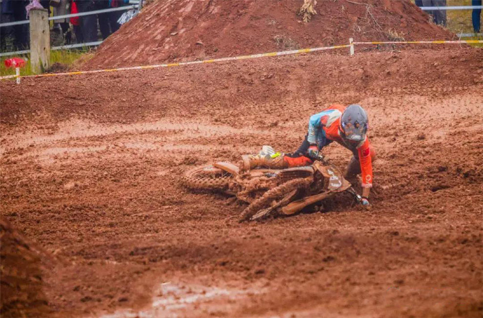 最后一天的比賽并沒有像前兩天那樣艷陽高照,持續(xù)的雨水讓賽道變得泥濘不堪,對每位車手都是一個(gè)巨大的考驗(yàn)。特別是分站成績由兩回合的分?jǐn)?shù)相加,所以當(dāng)天進(jìn)行的最后一場比賽非常關(guān)鍵。